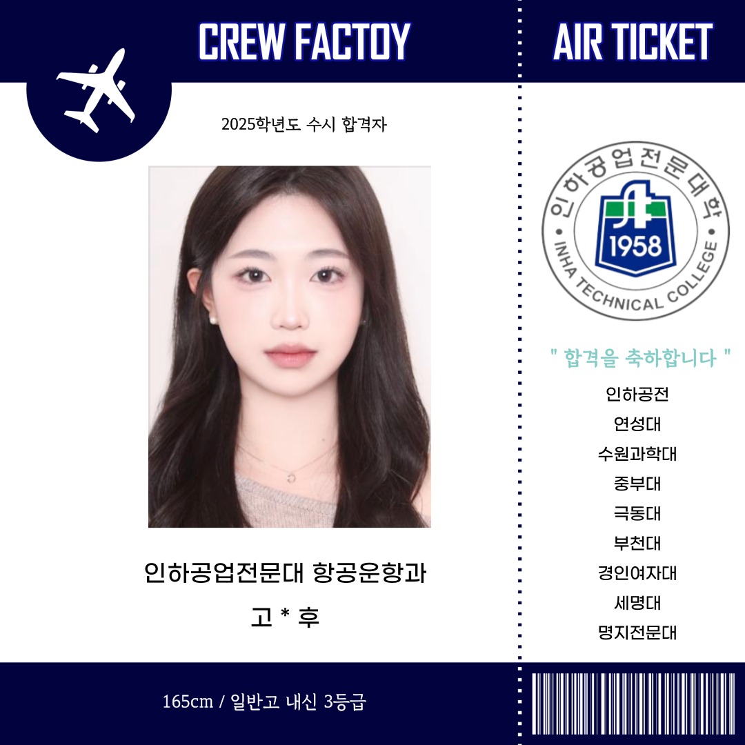 인하공업전문대학 항공운항과 / 연성대학교 항공서비스과 / 부천대학교 항공서비스과 외 6곳 합격
