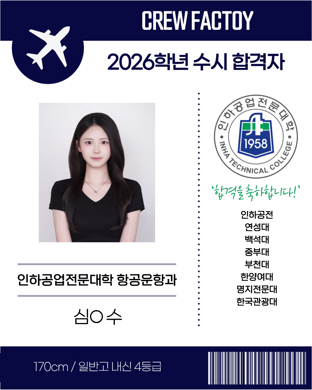 인하공업전문대학 항공운항과 / 백석대학교 항공서비스학과 / 연성대학교 항공서비스과 / 부천대학교 항공서비스과  / 한양여자대학교 항공과 외 3곳 합격